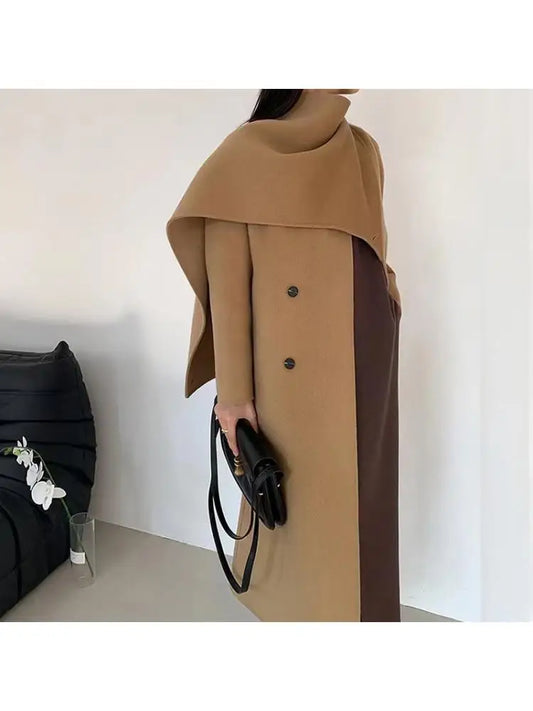 2023 Autumn And Winter Handmade Scarf Collar Woolen Jackets Double Breasted Solid Color Loose Lace Up Tie Women 100% Wool Coat