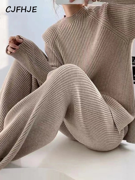 CJFHJE New Knitted Sweater Suit Women Elegant Solid O-Neck Pullovers Wide Leg Pants Suit Lady Winter Soft 2 Piece Set Homewear