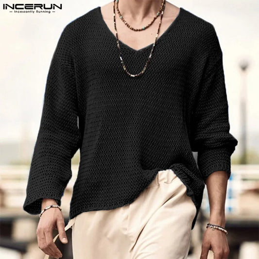 INCERUN Men T Shirt Solid Color Knitted V Neck Long Sleeve Casual Men Clothing Streetwear 2023 Hollow Out Loose Camisetas S-5XL